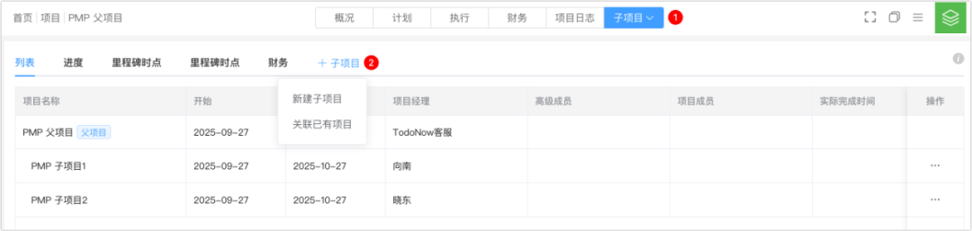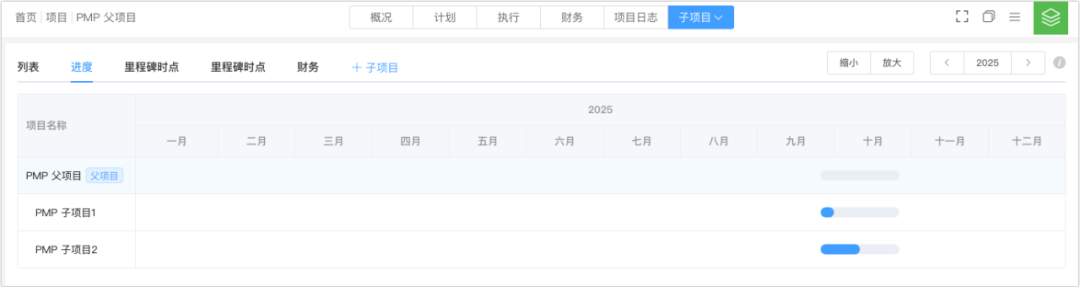 2. 在子项目页面,可以查看父子项目整体的项目进度、财务状况等。